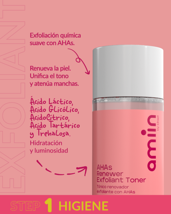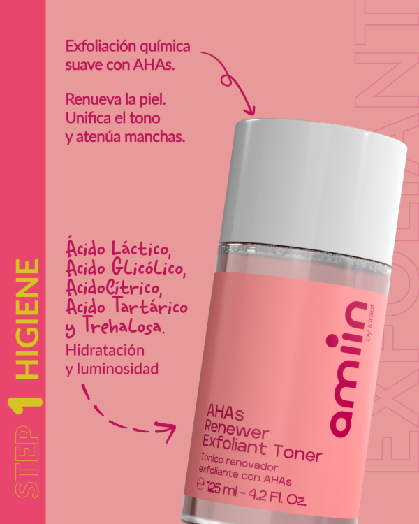 Tónico renovador formulado con ácido láctico, ácido glicólico y ácido citrico, ácido tartárico y trehalosa.